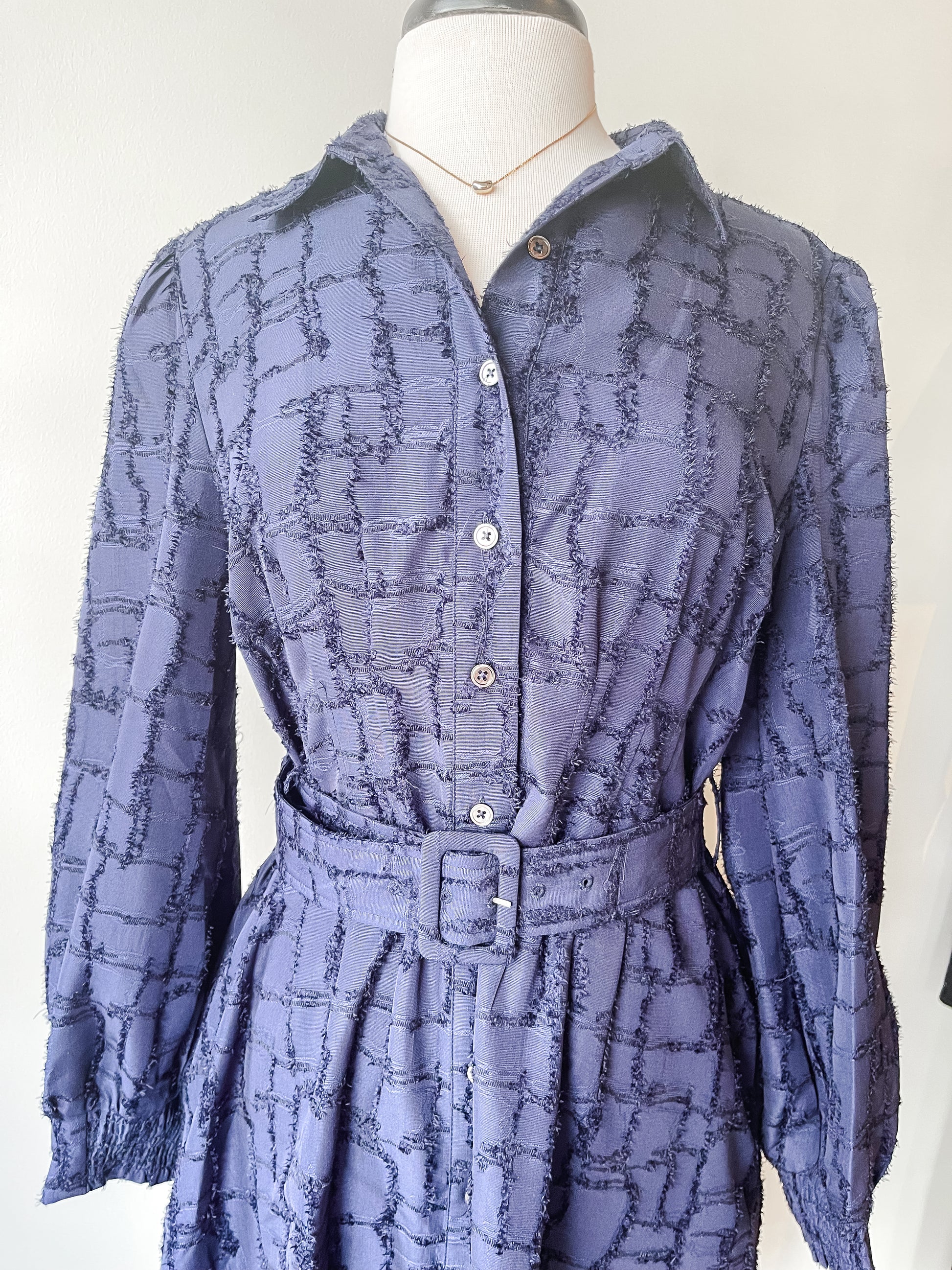 The Katalina Midi Dress features a refined grid-patterned texture and a classic shirt collar with a button-down front for a timeless look. Its long sleeves end in elegant half-smocked cuffs, while the self-waist belt with buckle accentuates your silhouette complemented by waist pleats. Practical side pockets enhance convenience, and the midi-length skirt offers a soft A-line flow for comfortable movement.