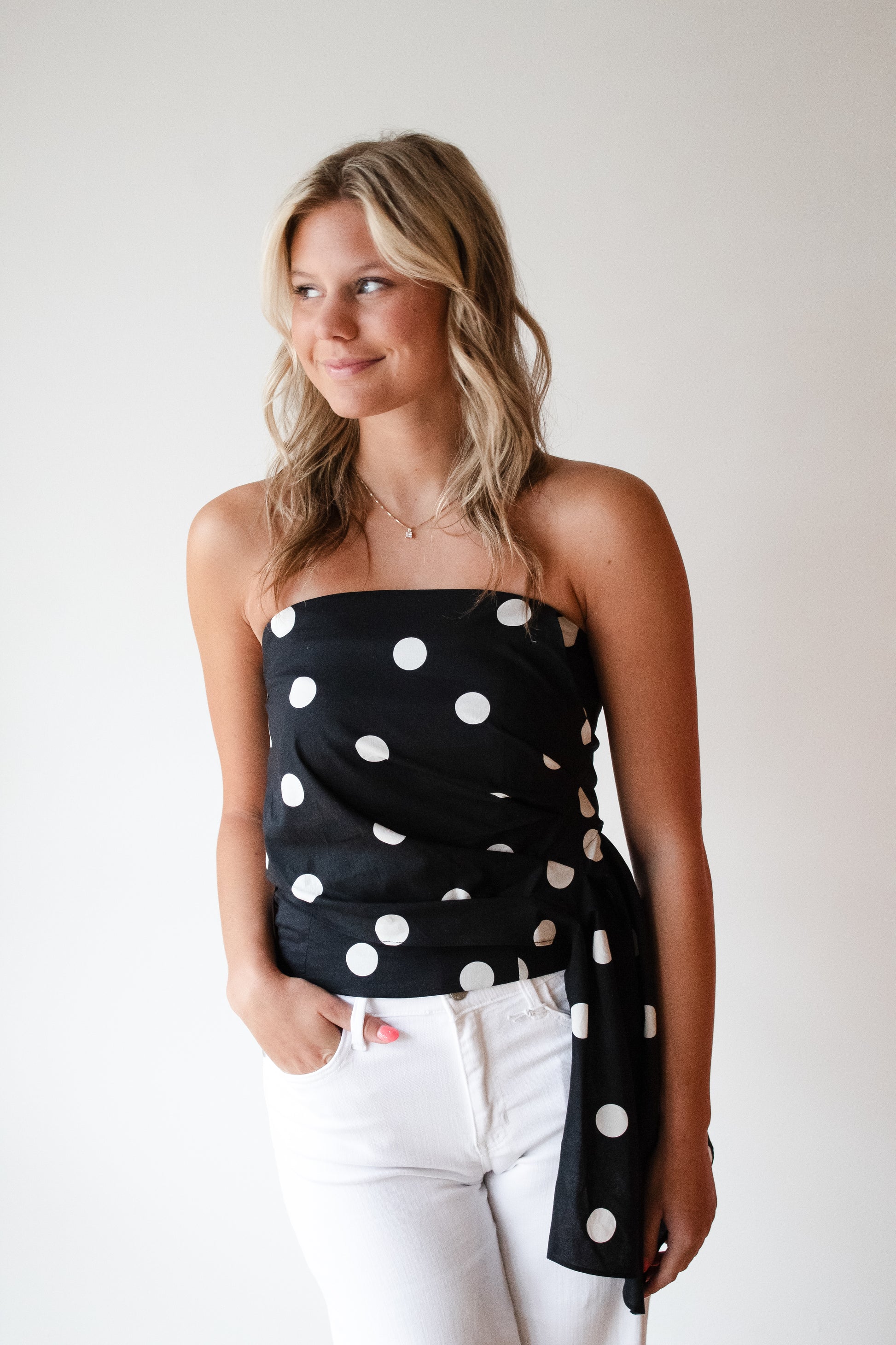 The Minnie Mae Tube Top combines elegance and versatility with its draped pleat detail and classic polka dot print on lightweight cotton voile. Designed as a bustier-style piece, it features a draped pleat side panel and an underlayer with fusing for structure. Adjustable, removable straps allow it to be worn as a strapless tube top, while the stretch smocking at the back ensures a comfortable, tailored fit. A hidden zipper closure completes the refined silhouette, making this top a sophisticated choice for both casual and dressier occasions.