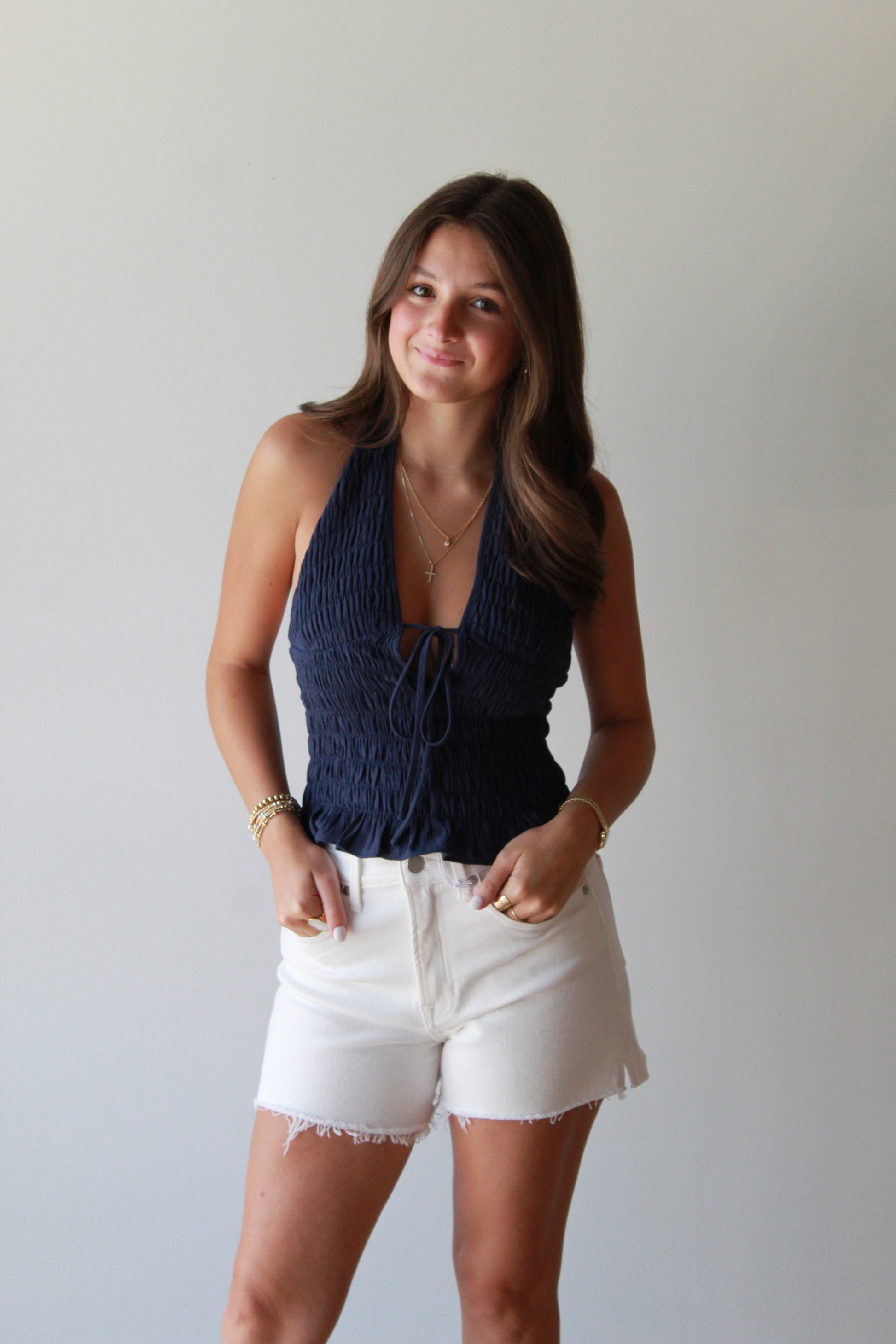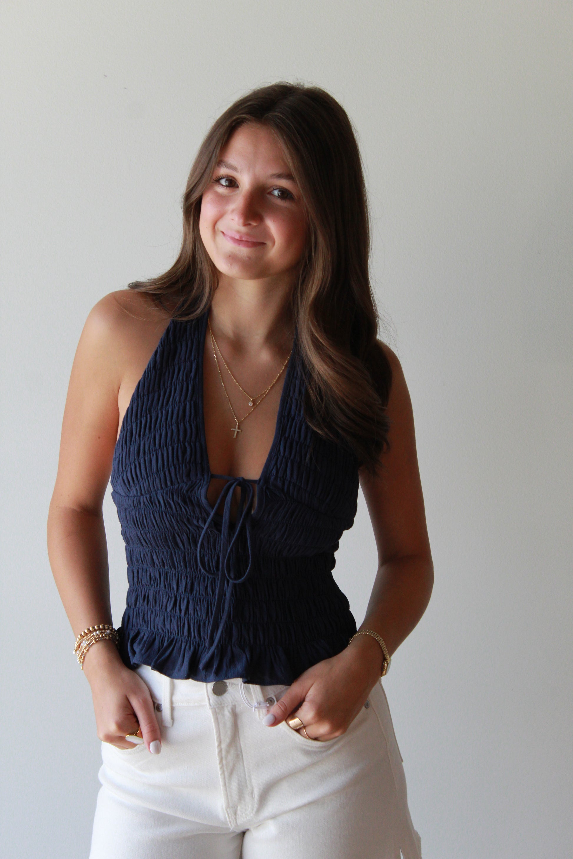 The Remi Halter Top features a sleek solid fabric with a flattering V-neckline and a stylish front tie detail, offering adjustable fit and added visual interest. Its halter design highlights the shoulders, making it an ideal choice for warm weather or layering. Crafted for both comfort and elegance, this top seamlessly blends casual ease with a refined silhouette.