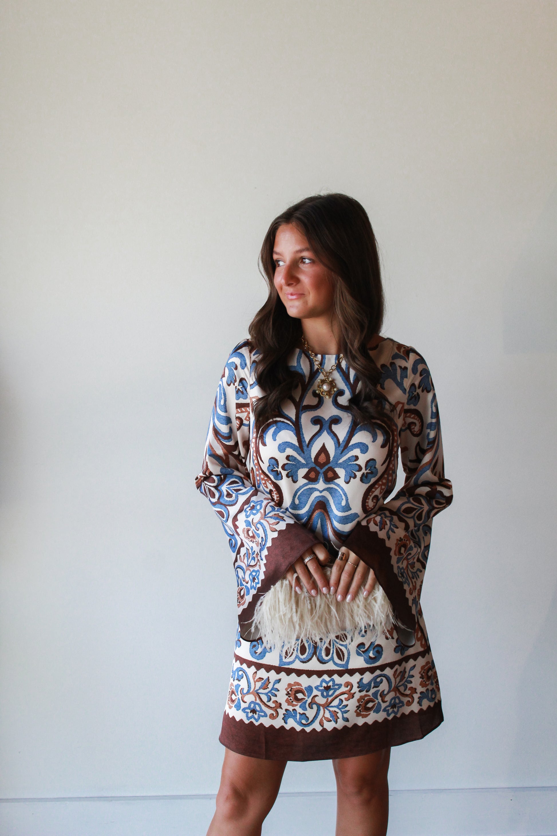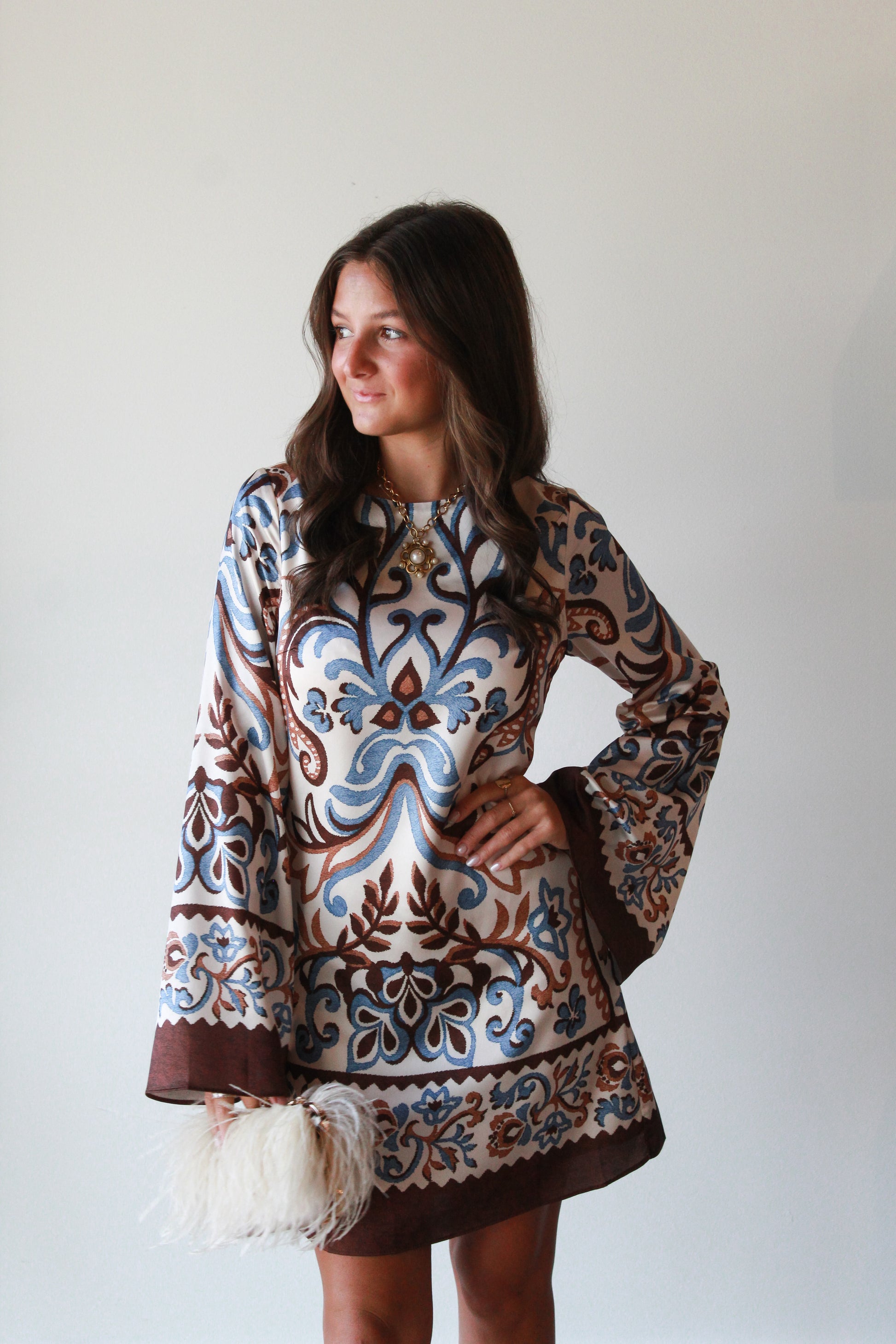The Sarah Mini Dress features a distinctive border print that adds refined style to a flattering silhouette. Crafted for ease and elegance, its tailored fit enhances movement while the mini length offers a modern, versatile look. Ideal for occasions where effortless sophistication is key, this dress balances statement design with comfortable wearability.