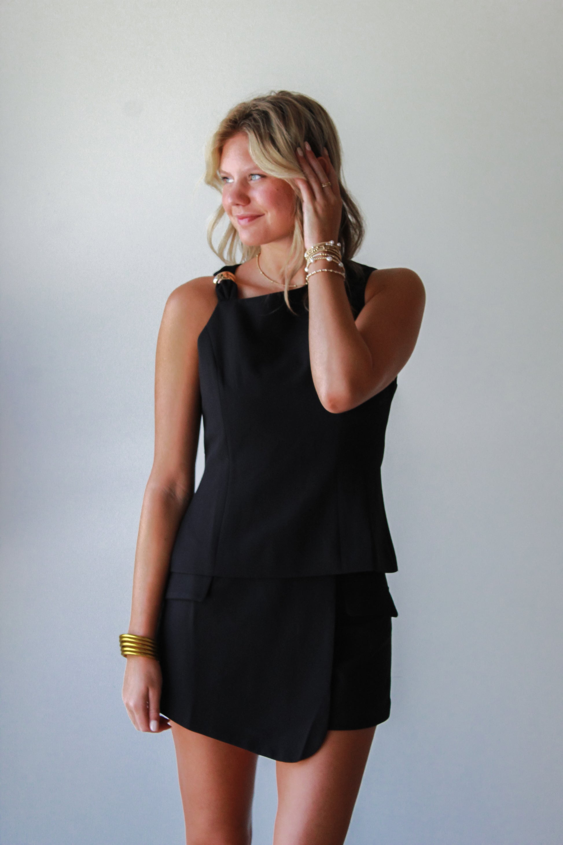 This sleeveless knotted top features a sophisticated golden applique that adds a touch of elegance to its design. Crafted for a flattering fit, the knotted detail enhances the silhouette while the sleeveless cut ensures comfort and versatility. Ideal for both casual and dressier occasions, this top combines style and refinement with expert tailoring.