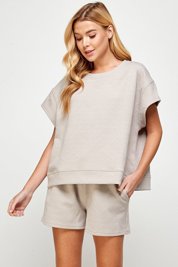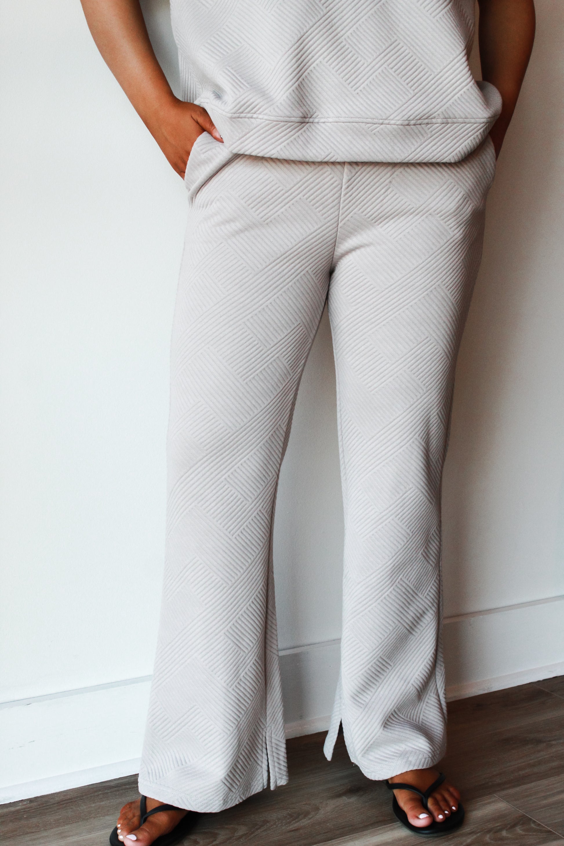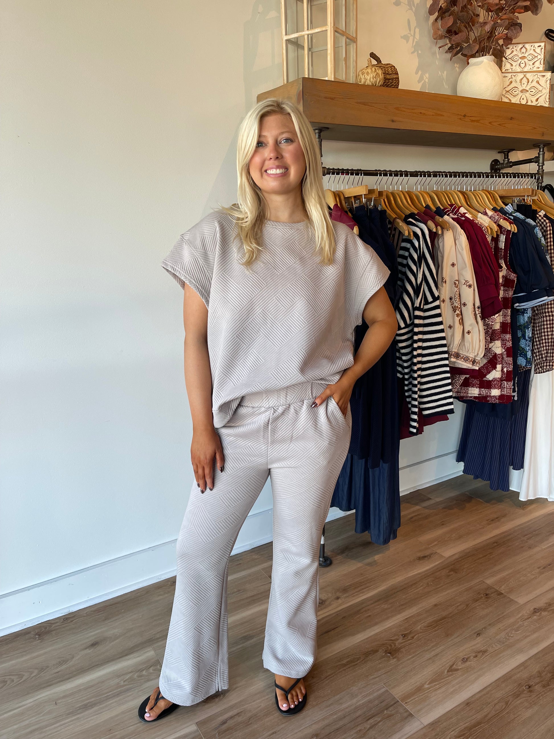 The Kaylie Set offers a sophisticated blend of comfort and style with its fitted wide-leg textured pants paired seamlessly with a textured crew neck top. Designed to flatter the silhouette while providing ease of movement, this ensemble is ideal for those seeking a polished yet relaxed look. The textured fabric adds depth and visual interest, making it a versatile choice for both professional settings and casual occasions.