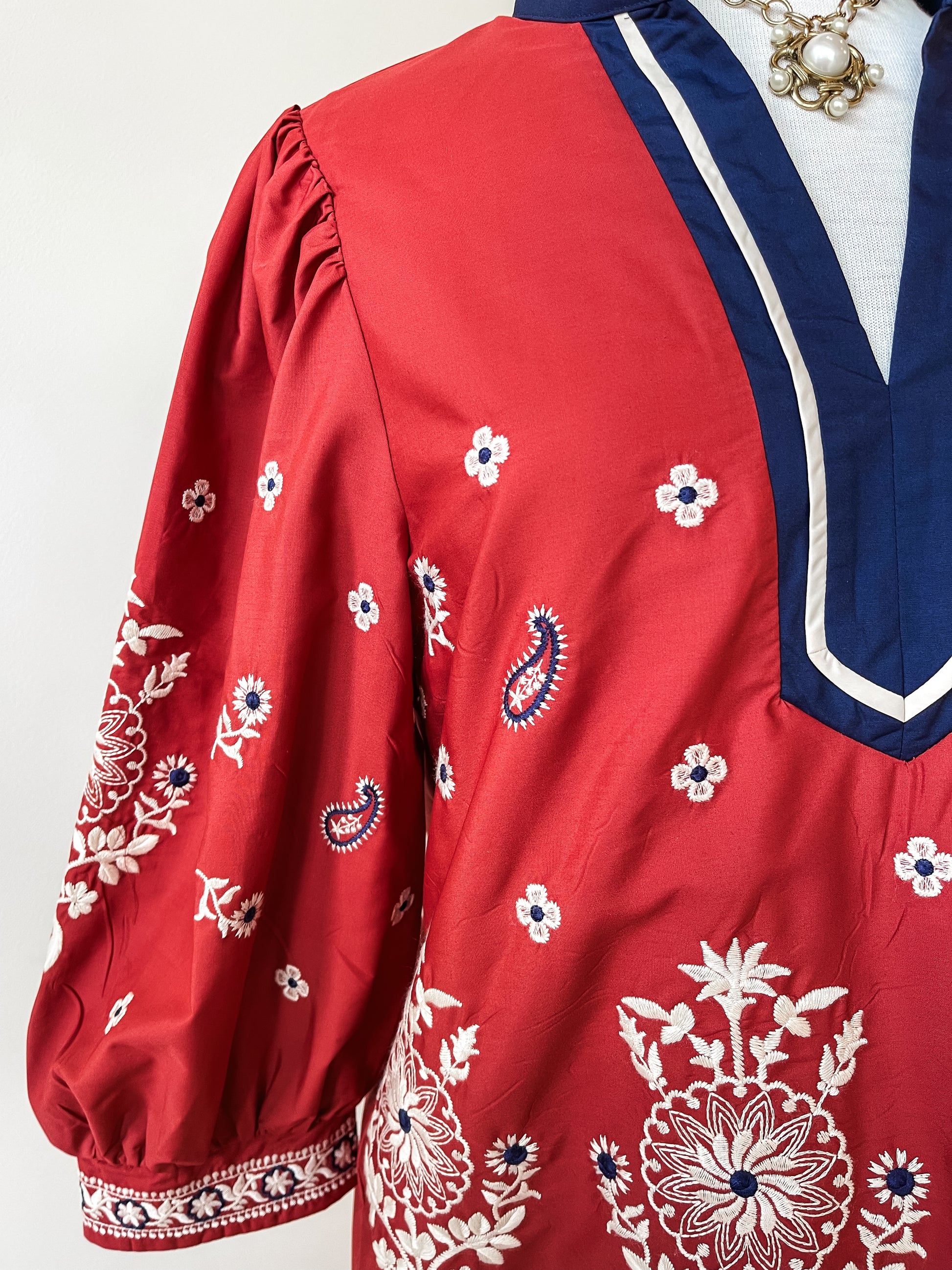 The Melinda Top is a lightweight woven garment that features delicate floral embroidery and stylish 3/4 puff sleeves, creating an elegant and feminine silhouette. Its contrast V-neck band collar introduces a sharp, modern touch, while the unlined, non-sheer construction ensures both comfort and modesty. This top is an excellent addition for versatile, expert styling.